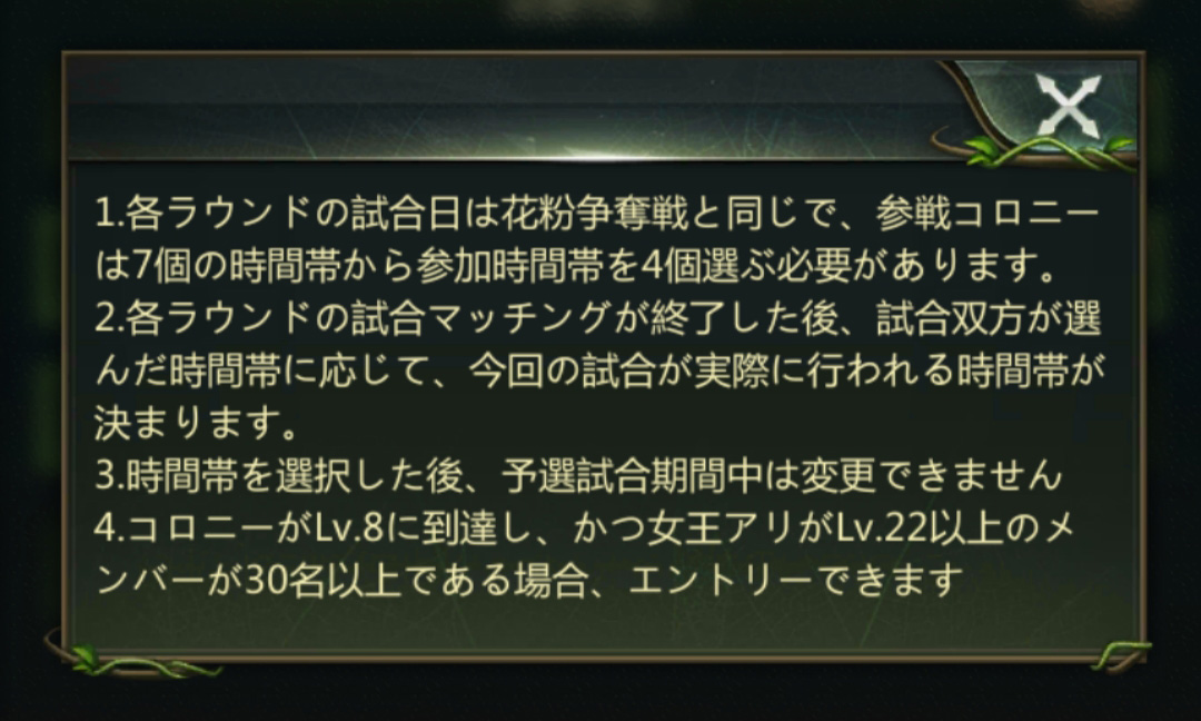 ※ただし、他のコロニーで花粉・荒地に参加した場合、その週の花粉リーグには参加することができなくなる。